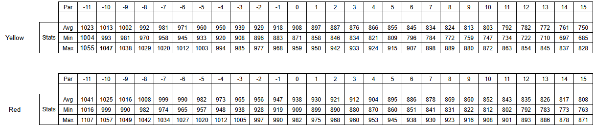 Given that I would like to consistently hit a 930+ rating on my rounds, it looks like I would need to throw a 2-under on the yellow layout and a 1-over round on the red layout to hit that mark for the day