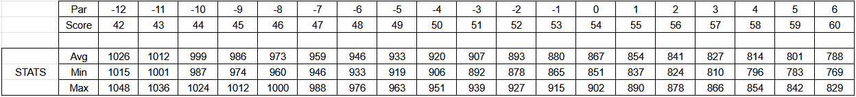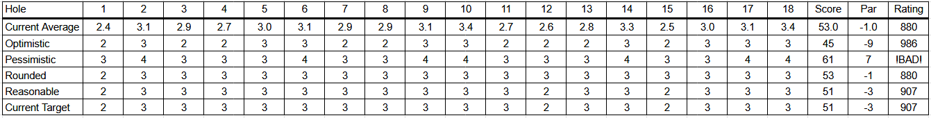 Given that I would like to consistently hit a 930+ rating on my rounds, I would need to throw a 5-under (49) round to hit that mark.